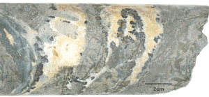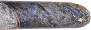 Gold mineralization is hosted within Triassic lapilli tuff, which is intruded by a Cretaceous quartz diorite and a feldspar porphyry dike of unknown age. The mineralization is associated with vein assemblages containing pyrite, sphalerite, and galena (Figure 2). While all three lithologies host gold, higher-grade intervals are preferentially located near the contacts between these units. Lower-grade mineralization occurs between the reported intervals. Analytical results for silver and other elements are pending from the laboratory.